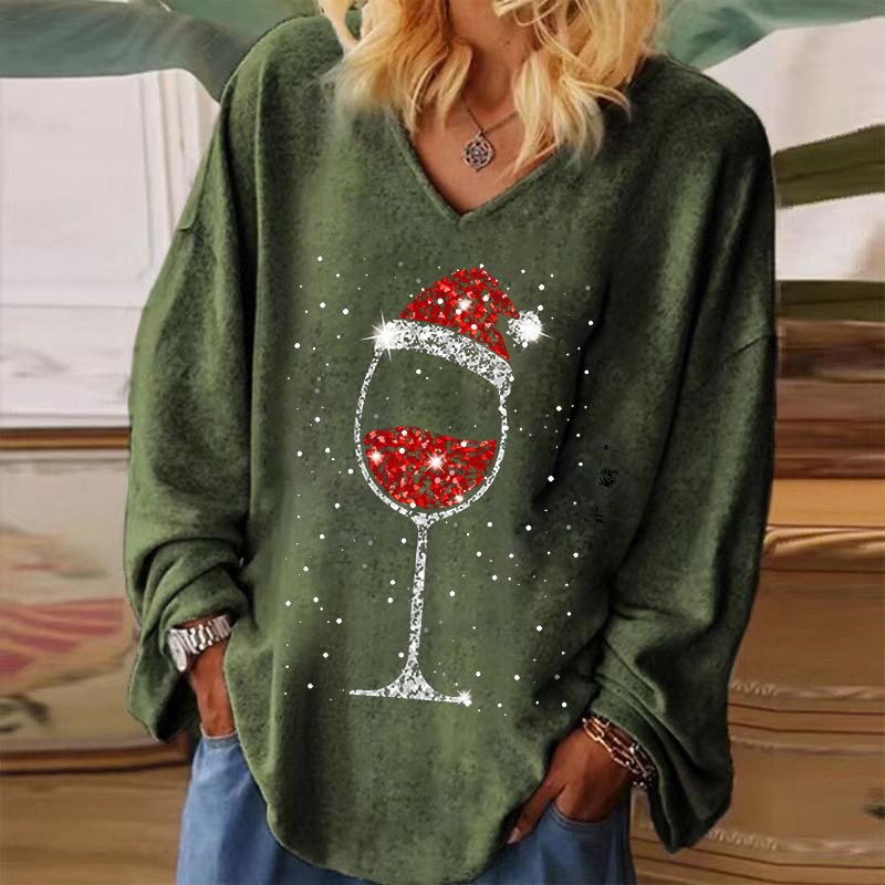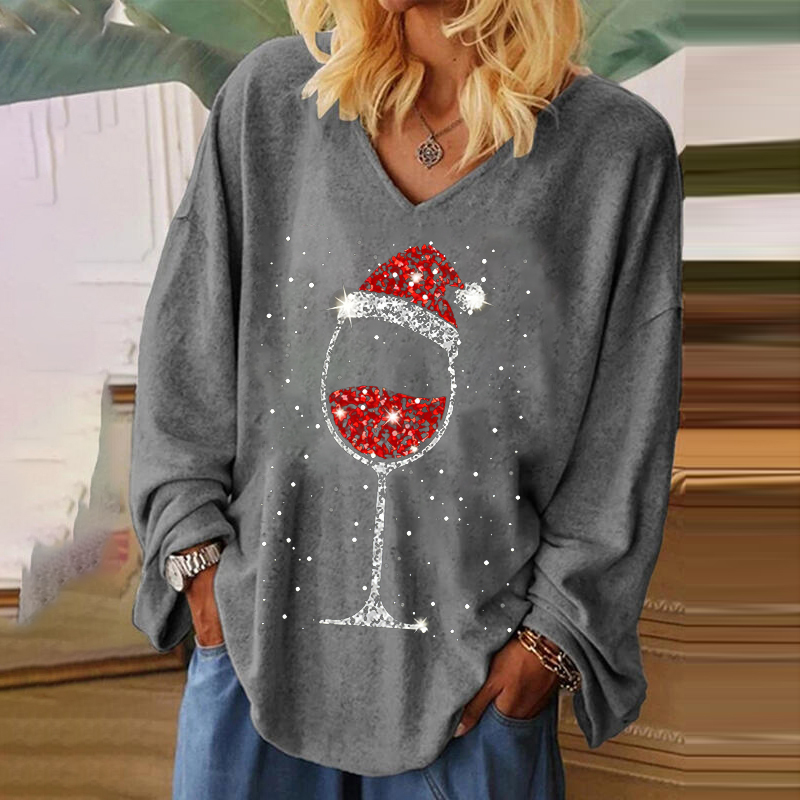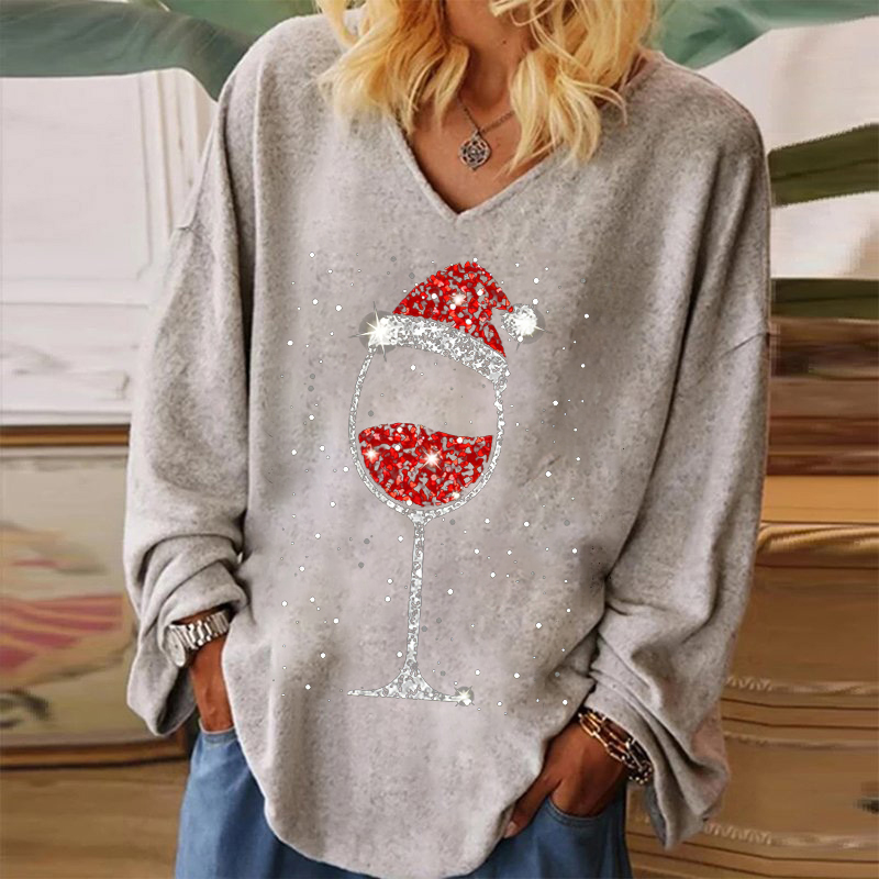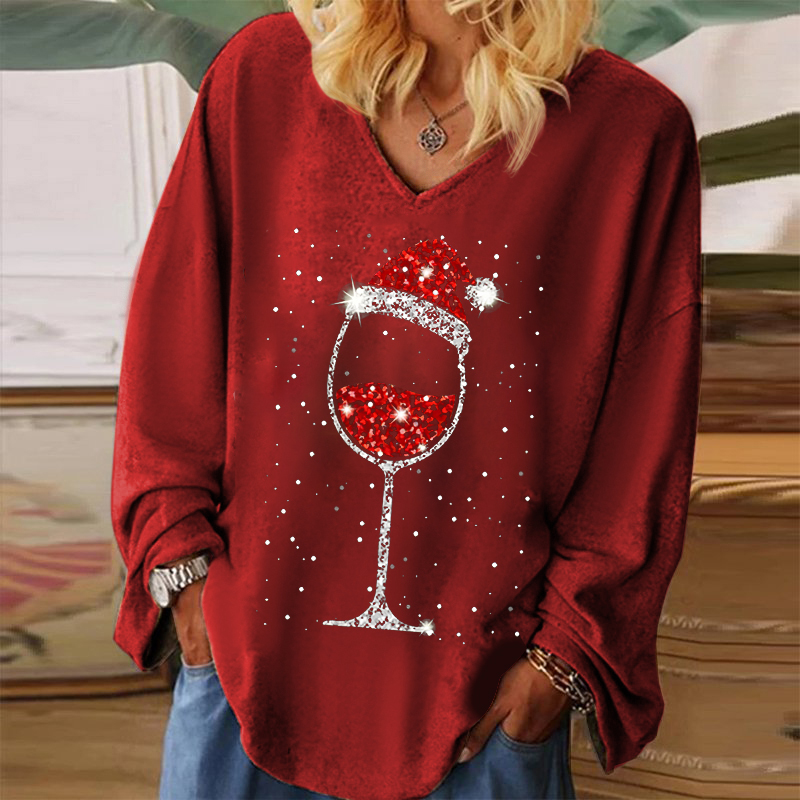 Made from soft, breathable fabric, it offers all-day comfort while the flattering V-neckline adds a feminine and modern feel. The unique print featuring a wine glass topped with a Christmas hat adds a delightful blend of holiday spirit and fun personality. Pair it with jeans, leggings, or a festive cardigan for an effortlessly merry outfit.